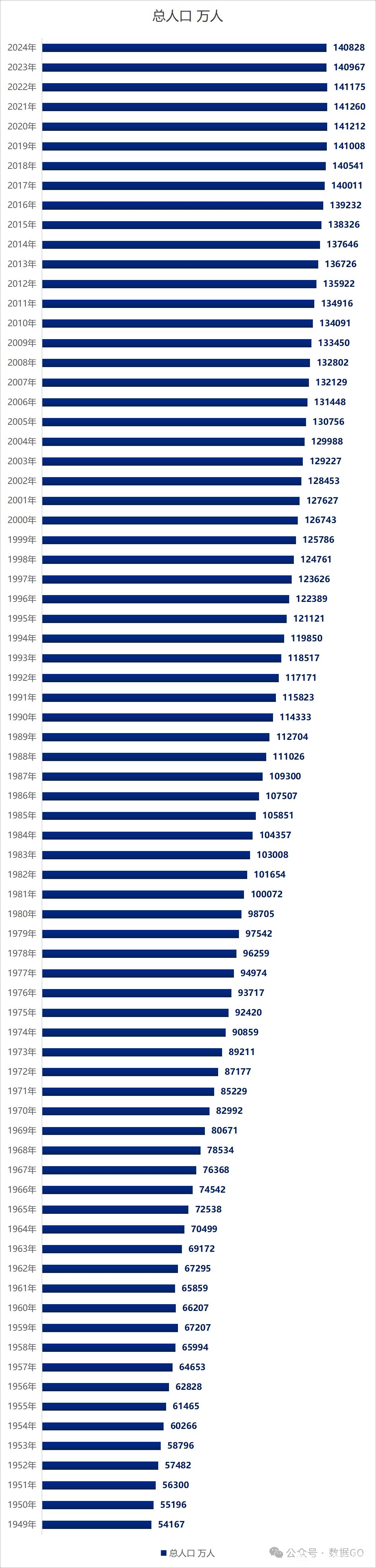 这是中华人民共和国自1949年成立至2024年(含最新公布数据)的历年总人口数据概览。